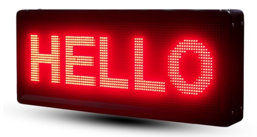 Polski, bardzo dobrze widoczny, graficzno - tekstowy wyświetlacz led, tablica led zewnętrzna o dużej rozdzielczości i jasności diod. Rozdzielczość 4608 pixeli. Kolor diod czerwony. Produkcja pod klienta. Całą powierzchnia czynna ekranu wys. 48 cm x szer. 96 cm