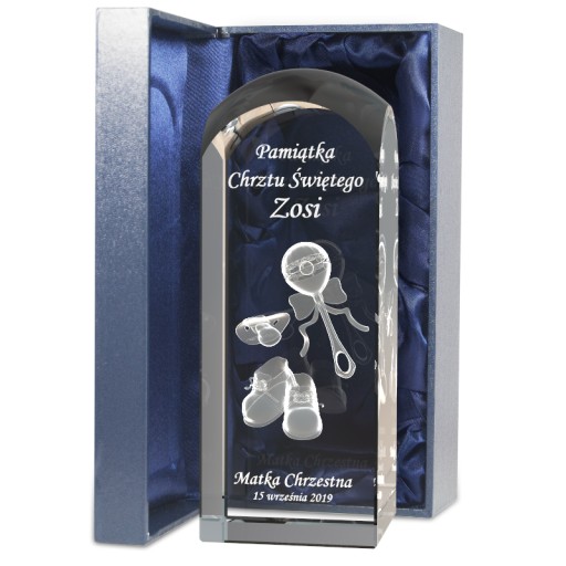 Wygrawerowane trójwymiarowe buciki, grzechotka i smoczek wraz z własną dedykacją w kryształowym obelisku stanowi niezwykle efektowny PREZENT na pamiątkę tak uroczystej okazji jaką jest Chrzest Święty.