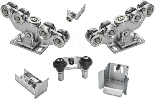 Komplet wózków 9 rolkowych z akcesoriami do szyny 80x80x5 mm - zestaw dedykowany do dużych, ciężkich bram przesuwnych o wadze 1200 kg.