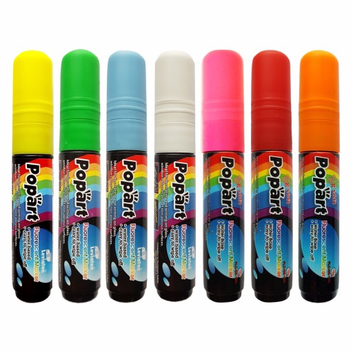 Grubopiszące markery kredowe POPART 15g przeznaczone są do potykaczy, tablic i tabliczek, szkła, plastiku oraz innych gładkich powierzchni. Zawierają 15g płynnej kredy. Dostępne są w 7 fluorescencyjnych kolorach do wyboru. Żywe, fluorescencyjne kolory umożliwiają tworzenie wielobarwnych, doskonale zwracających uwagę kompozycji. Dzięki markerom POPART 15g Twoja reklama będzie widoczna. Ścięta skośnie końcówka pisaka POPART daje możliwość zmiennego, fantazyjnego prowadzenia linii pisania od 1 mm do 10 mm szerokości. Miękka końcówka markerów nie niszczy powierzchni do pisania, dlatego Twój potykacz, tablica czy tabliczka kredowa będą Ci służyć znacznie dłużej niż przy użyciu zwykłej kredy.