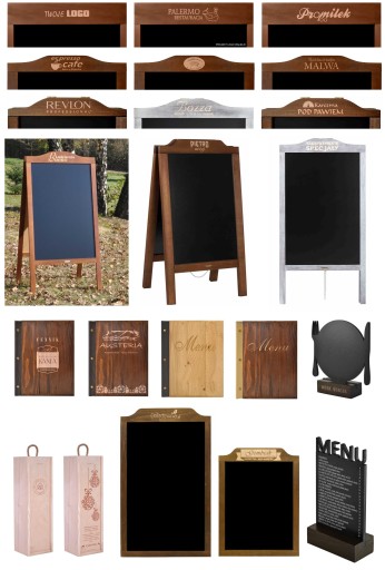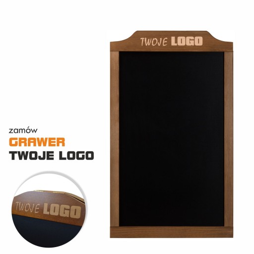 Duża pionowa tablica kredowa w drewnianej ramie z listwą górną w kształcie fali. Można po niej pisać kredą lub markerem kredowym. Tablica zwraca uwagę, a ze względu na swoje duże rozmiary może znajdować się w większej odległości od odbiorcy. Doskonale prezentuje się na sztaludze. Na górnej listwie tablicy można dodatkowo wygrawerować laserem Twoje LOGO, nazwę firmy czy reklamę. Tablica z grawerem zdecydowanie skuteczniej przykuwa uwagę potencjalnych klientów.