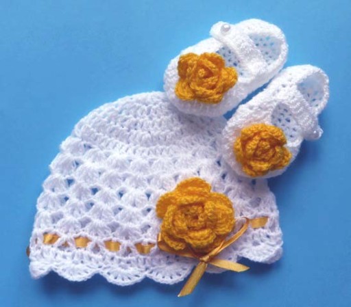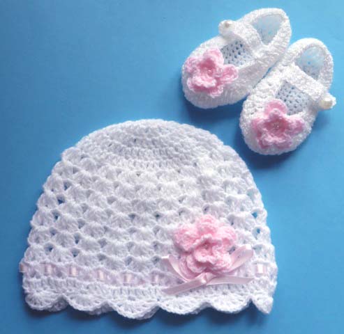 Komplet szydełkowy: czapeczka+buciki może być wykonany w dowolnym kolorze włóczki i dodatków.