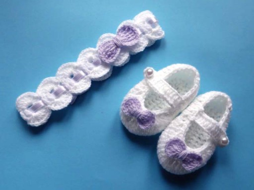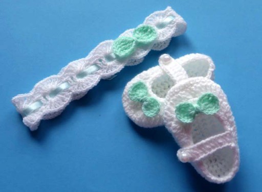 Komplet szydełkowy: opaska+buciki może być wykonany w dowolnym kolorze włóczki i dodatków.