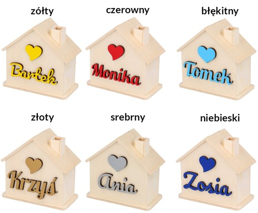 Mamy coś dla Ciebie! Skarbonka z przestrzennym imieniem dziecka i z sercem w 6-ciu różnych kolorach.