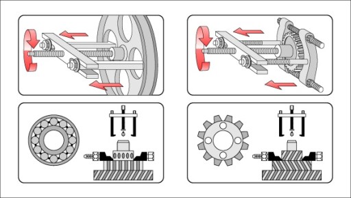 Ściągacz przeznaczony jest do demontażu kół zębatych, łożysk, tarcz hamulcowych oraz innych elementów ciasno pasowanych na różnego rodzaju osiach.