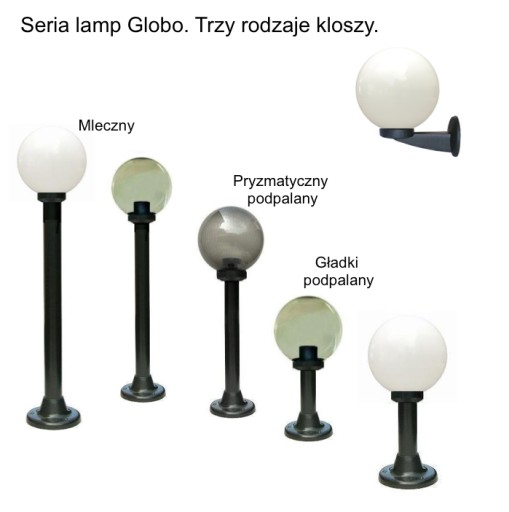 Lampa ogrodowa Globo, o wysokości całkowitej z kloszem ; 35 cm. Lampa z tworzywa sztucznego odpornego na warunki atmosferyczne. Seria lamp Globo. Bardzo mocne klosze produkcji włoskiej. Klosze wkręcane z gwintem fi 84,5 mm