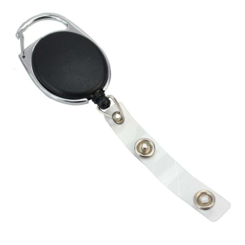 RETRAKTOR: SAMOZWIJAJĄCA SIĘ LINKA NYLONOWA: 60 cm, CHROMOWANY KARABIŃCZYK, KOLOR: CZARNY, SILIKONOWY PASEK Z KLIPSEM, WYMIARY: 63 x 34 x 10 mm, MASA: 17 g, BRAK KÓŁKA NA KLUCZE