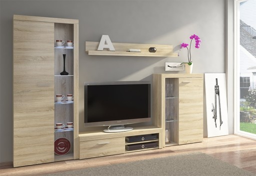 Nowoczesna meblościanka z miejscem na telewizor nadająca się do każdego wnętrza. Nadaje się do salonu. Meblościanka zachwyci swoim wyglądem oraz funkcjonalnością. Zestaw wykonany jest z grubej płyty laminowanej z wzmocnionymi obrzeżami ABS, listwy natomiast wykonane są z płyty MDF.Zestaw jest bardzo odporny na wilgoć oraz zabrudzenia. Zestaw posiada uchwyty wykonane z tworzywa sztucznego. W skład zestawu wchodzą: witryna stojąca duża, szafka RTV, półka wisząca oraz witryna stojąca mała.