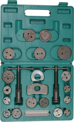 W zestawie znajdują się 2 prasy (prawo i lewo skrętna), belka do zapierania prasy o siodło zacisku oraz 19 adapterów dostosowanych do wielkości tłoczków hamulcowych stosowanych w większości samochodów osobowych produkowanych na rynku europejskim oraz azjatyckim.