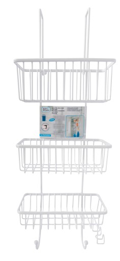 - Z jednej strony posiada trzy koszyki na akcesoria i cztery haczyki na ręcznik, z drugie strony dwa haczyki na ręcznik