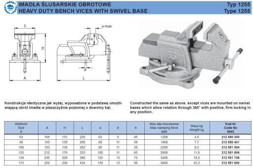 IMADŁO ŚLUSARSKI Z PODSTAWĄ OBROTOWĄ UMOŻLIWIAJĄCĄ OBRÓT IMADŁĄ W PŁASZCZYŹNIE POZIOMEJ O DOWOLNY KĄT, TYP 1255-100 POLSKIEJ RENOMOWANEJ FIRMY BISON-BIAL.