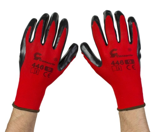 - Rękawice ochronne wykonane z czerwonego nylonu powlekanego nitrylem w kolorze czarnym