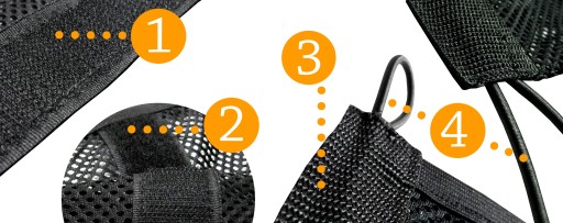 1. Dolna taśma stabilizująca siatkę 2. Mocny rzep oddzielający komory 3. Wzmocniona taśma brzegowa 4. Linki montażowe
