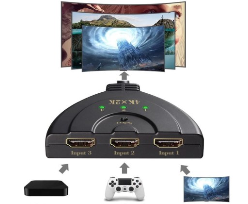 Przełącznik / Switch umożliwia podłączenie 3 urządzeń do jednego monitora lub telewizora. Wybór, które urządzenie jest aktywne i korzysta aktualnie z monitora - następuje ręcznie.