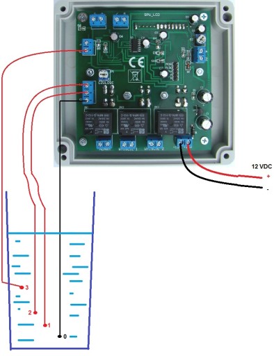 poziomem cieczy nie przewodzącej prądu. Podłączenie czujników wg poniższego schematu czyli jeden przewód
