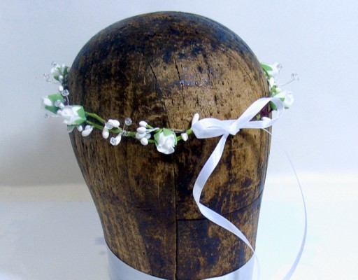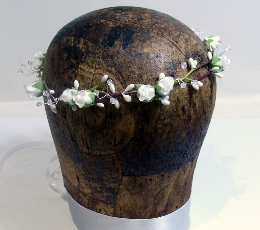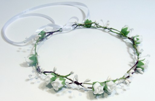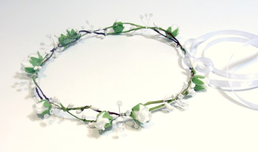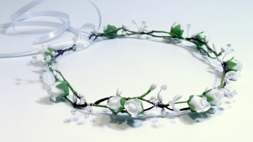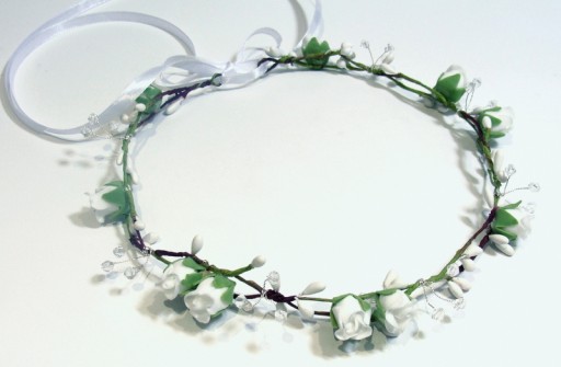 Kompozycja w kolorach zieleni i bieli wykonana z elementów do złudzenia przypominających żywe rośliny, ozdobiona kryształkami na srebrnym druciku.
