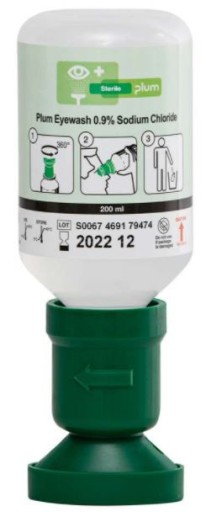 Butelka o pojemności 200 ml może być elementem wyposażenia apteczek pierwszej pomocy lub służyć jako uzupełnienie stacji PLUM EYE WASH mocowanej do ściany.