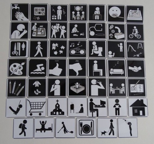 - 48 szt. zalaminowanych piktogramów do określania czynności, obowiązków, przedstawienia sytuacji do zaczepiania na tablicy i nie tylko