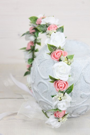 Prześliczny wianek komunijny, pełen białych i łososiowych kwiatów róży, zdobiony listkami bluszczu oraz innymi stylowymi dodatkami.