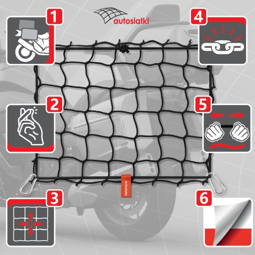 Wytrzymała siatka w gumowym oplocie. Montowana do fabrycznych uchwytów na dnie kufra. Stabilizuje przedmioty, pomaga utrzymać porządek i uniknąć przypadkowego przesuwania się przewożonej zawartości. Sprawdzi się jako zabezpieczenie jednego lub dwóch kasków.