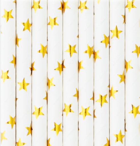 Słomki papierowe, białe w złote gwiazdki, proste, opakowanie 10 sztuk. Długość 19,5 cm, średnica ok. 7 mm.