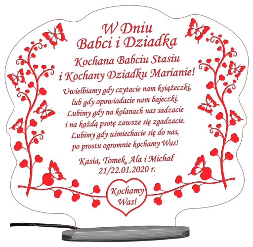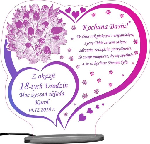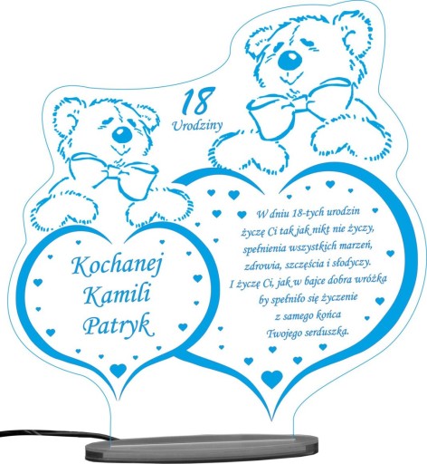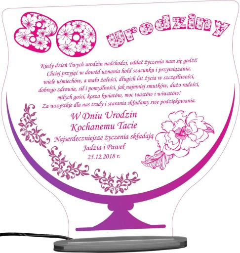 Do zaoferowania mamy unikalne podświetlane statuetki na urodziny, imieniny. Statuetki wykonane są z wysokiej jakości przezroczystego akrylu o grubości 5 mm, na którym znajduje się biały grawer. Po włączeniu podświetlenia grawer świeci na kolor przez Państwa wybrany. Statuetka zasilana jest zasilaczem wtyczkowym przymocowanym do statuetki na stałe.