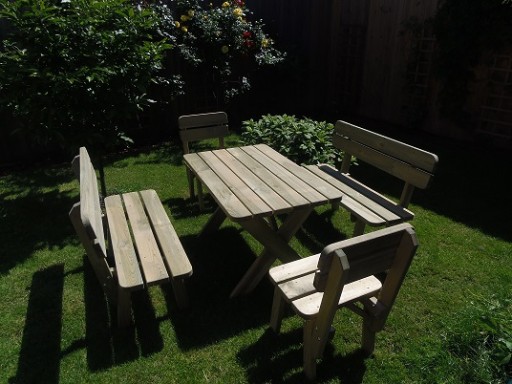 Nowe - nie wymagają dodatkowego malowania w celu zabezpieczenia drewna. W zależności od stopnia ekspozycji drewna na szkodliwe warunki zewnętrzne, zaleca się ponowną impregnację mebli po upływie 1-2 lat dowolnym środkiem do impregnacji drewna na zewnątrz. W celu nadania im innego koloru już teraz, można je we własnym zakresie dodatkowo pomalować. Każdy ciemniejszy kolor, pokryje jasno-zielony odcień po impregnacji.
