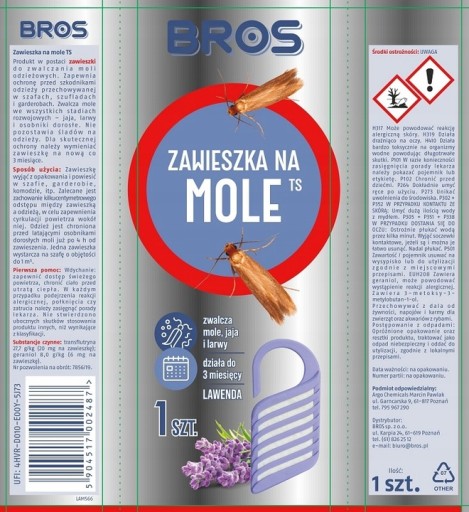 Profesjonalna zawieszka na mole stosowana w miejscach przechowywania odzieży, tkanin, kocy, itp. Zawieszka skutecznie chroni odzież, tkaniny, futra przed działaniem moli. Można ją stosować w garderobach, szafach, szufladach, walizkach itp.