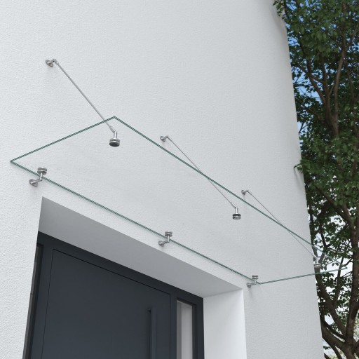 Zestaw składa się z: tafli szkła (laminowane 13mm hartowane szkło bezpieczne VSG), dźwigary ze stali nierdzewnej (dla tafli szkła od 120 do 200 cm znajdują się dwa dźwigary a od 250 do 300 cm trzy dźwigary) i zestaw mocujący.