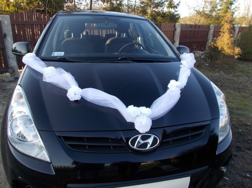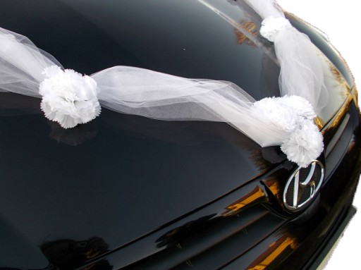 Dekoracja przednia to biała tiulowa girlanda, na której umocowanych jest 9 kwiatków.