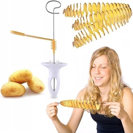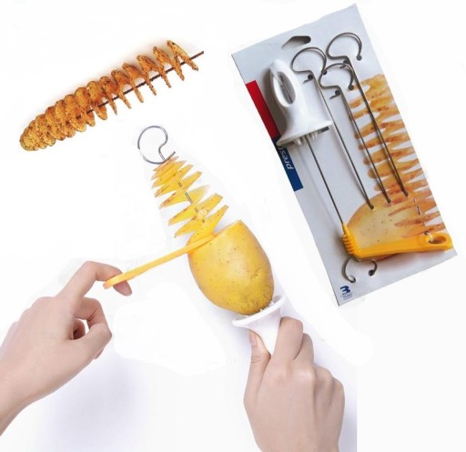 - W zestawie: "Ziemniaczany" zestaw zawiera spiralny wykrawacz z wyjątkowo ostrym ostrzem, masywną rękojeść z haczykami do umocowania ziemniaków oraz 4 szpikulce ze stali nierdzewnej.