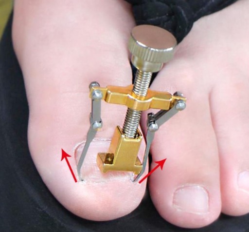 3. Z jednej strony paznokcia wrośniętego, wyreguluj sprzęt pod odpowiednim kątem, na wypadek, gdy zrani się druga strona zdrowia (tylko wzmocnij wrośniętą paznokieć). Dokręcaj z wyczuciem nie na siłę. W innym wypadku może dojść do pęknięcia paznokcia!!!