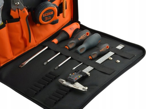 Torba monterska NEO poliester 600D, sztywny profilowany uchwyt, 17 kieszeni wewnętrznych, 2 kieszenie zewnętrzne, sztywna konstrukcja, 3 komory główne, wzmocnione zamki, wyjmowana przegroda komory środkowej, gumowe podstawki, pasek na ramię, uchwyt do przenoszenia.