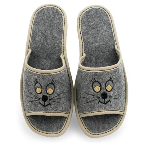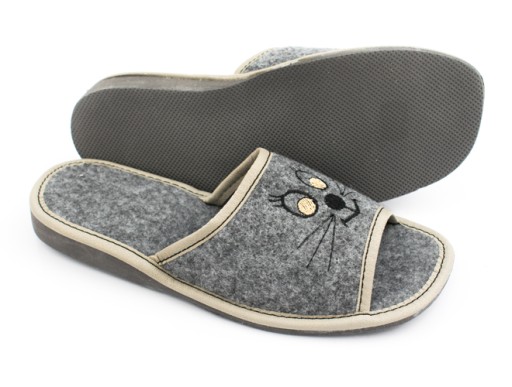 - Pantofle ozdobione są uroczym haftem w kształcie kotka,