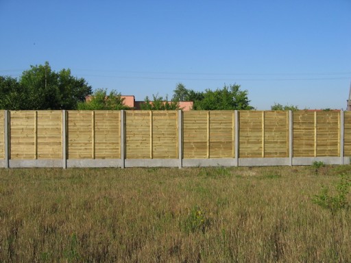 Szkieletem płotu jest zamaskowany deską frezowaną na bokach słupek żelbetowy wraz z płytą żelbetową o wys. 25 cm, w opcji jest dostępne maskowanie drugiej strony słupka + daszek za dopłatą. Wypełnienie stanowią deski heblowane o grubości 2,2 /lub 2,5 cm za dopłatą/ i szerokości ok.10,5 cm. Możemy również zaoferować ogrodzenie na słupkach metalowych za dopłatą.