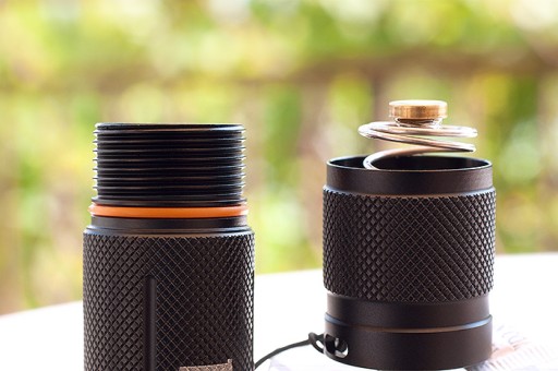 Fotografia prezentująca jakość gwintów, powłoki HA III i grubej sprężyny z mosiężnym stykiem przy włączniku, zapobiegającej jakimkolwiek miganiom latarki na wybojach, przeskakiwaniem trybów itp.