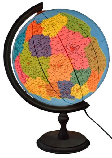 Podświetlany globus o średnicy 32 cm przedstawiający dwie mapy Polski. Po jednej stronie kuli mapa fizyczna Polski, po drugiej mapa z podziałem administracyjnym.