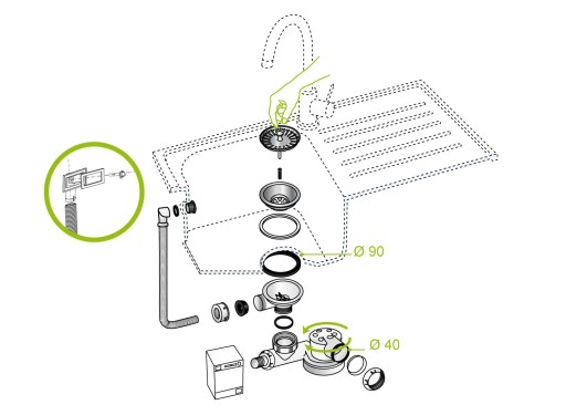 Syfon do zlewozmywaka pojedynczy niski z przelewem prostokątnym, wyjściem do podłączenia zmywarki lub pralki firmy WIRQUIN