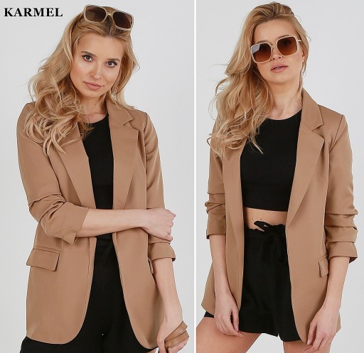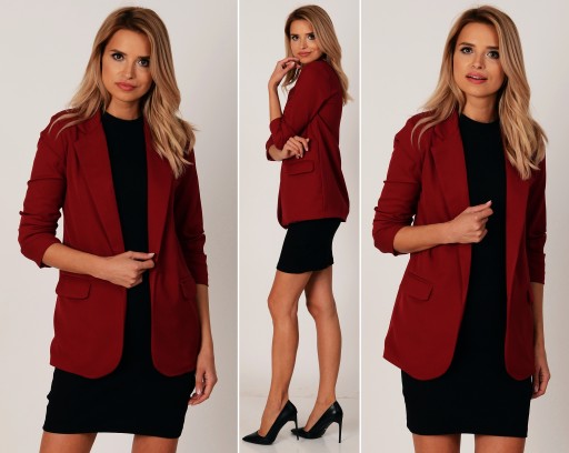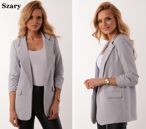 Model dłuższy, smokingowy pasujący do eleganckiego jaki i casualowego stylu. Doskonałe dopełnienie stylizacji do pracy, na uczelnie lub na wieczorne wyjście. Oryginalnego charakteru dodają drapowane rękawy o długości 3/4. Dwie kieszonki po bokach z efektownymi klapami upiększają marynarkę. Fason luźny, z podszewką i miękkimi poduszkami w ramionach.