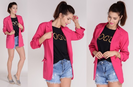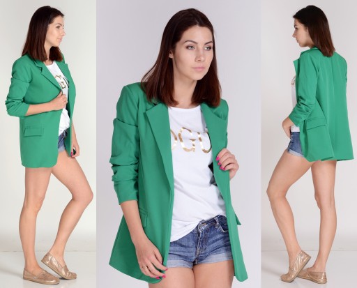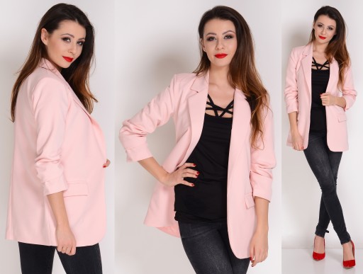 Model dłuższy, smokingowy pasujący do eleganckiego jaki i casualowego stylu. Doskonałe dopełnienie stylizacji do pracy, na uczelnie lub na wieczorne wyjście. Oryginalnego charakteru dodają drapowane rękawy o długości 3/4. Dwie kieszonki po bokach z efektownymi klapami upiększają marynarkę. Fason luźny, z podszewką i miękkimi poduszkami w ramionach.