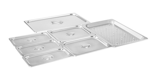 W zestawie pojemniki 1 x GN 1/1 + 2 x GN 1/2 + 3 x GN 1/3 wraz z pokrywkami