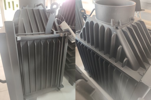 Żeliwne wykończenie komory spalania w kolorze czarnym.