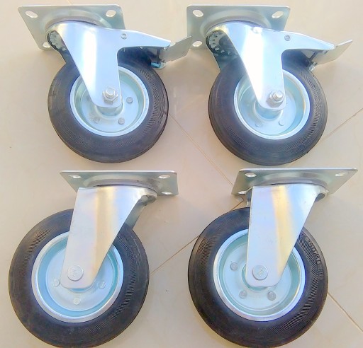 Koła mocowane na tzw. płytkę są połączeniem widelca wykonanego z tłoczonej blachy stalowej oraz koła z piastą stalową i oponką z pełnej, czarnej gumy. Głowica skrętna widelca jest podwójnie ułożyskowana oraz jest zabezpieczona przed zabrudzeniem specjalnym uszczelnieniem przeciwpyłowym. Wszystkie elementy metalowe zestawu pokryte są antykorozyjną powłoką chromowo-cynkową. Hamulec blokuje koło i głowicę.