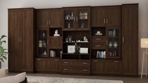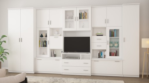 ⏺ Meblościanka składa się z oddzielnych segmentów tworzących razem kompletny zestaw pokojowy. W razie potrzeby segmenty mogą stać jednak oddzielnie!