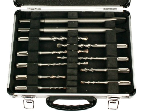 - Wyposażona wewnątrz w specjalnie wyprofilowane uchwyty, dzięki którym każde wiertło, bądź dłuto ma swoje odpowiednie miejsce, co w znacznym stopniu ułatwia utrzymania porządku w walizce.