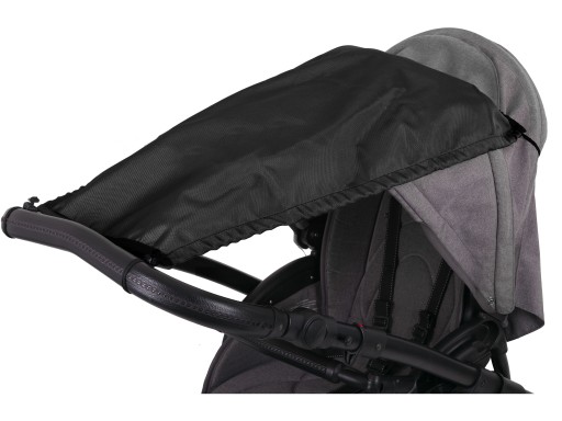 Daszek montowany za pomocą gumki przekładanej przez budkę. Z przodu zawiązywany dzięki dwoma sznurkami do rączki wózka. Dodatkowo możliwość regulacji daszka za pomocą sznurka i stoperów. W zależności od kąta padania promieni słonecznych można przesuwać osłonkę na boki, regulując je na sznurkach oraz gumie