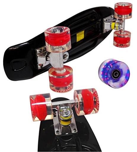 W deskorolce zastosowano najlepszej jakości łożyska ABEC 7. oraz kółka LED wykonane z syntetycznego kauczuku o szerokości 45mm i średnicy 60mm