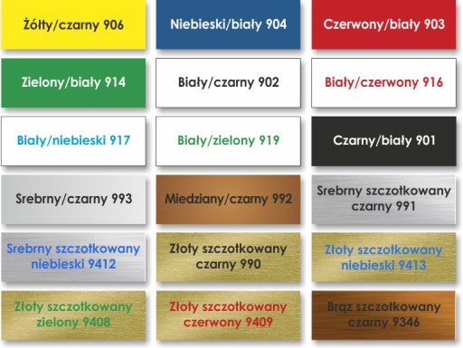 W nazwie koloru pierwszy oznacza kolor tabliczki a drugi kolor napisu.