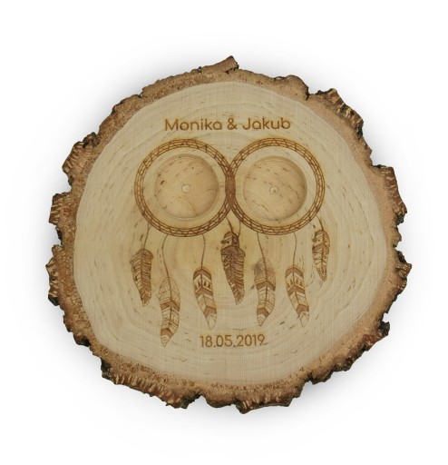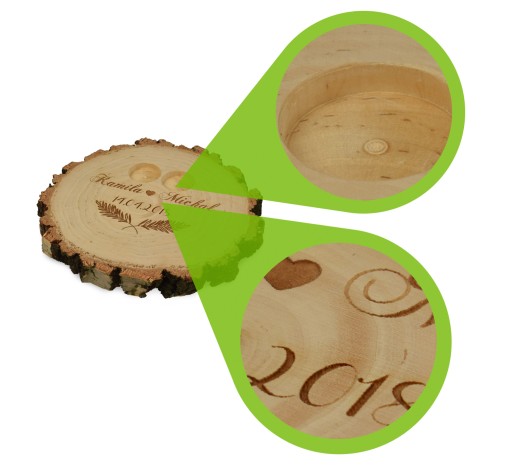 Przedstawiamy pudełko/podstawkę na obrączki ślubne wykonaną z naturalnego plastra drewna wraz z spersonalizowanym grawerem.