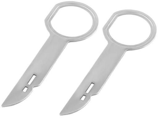 Uniwersalny zestaw 2 sztuk kluczy do wyjmowania radia samochodowego.